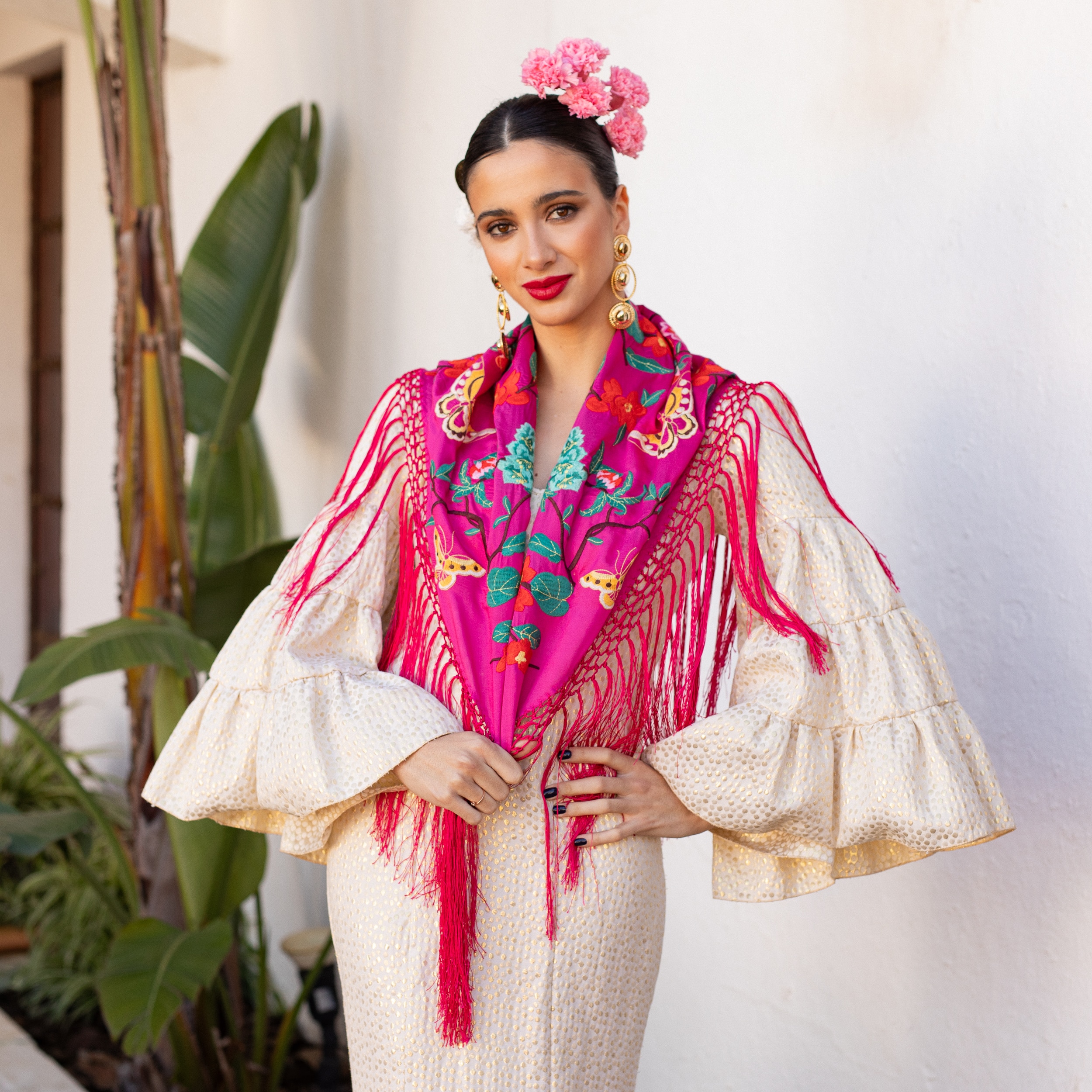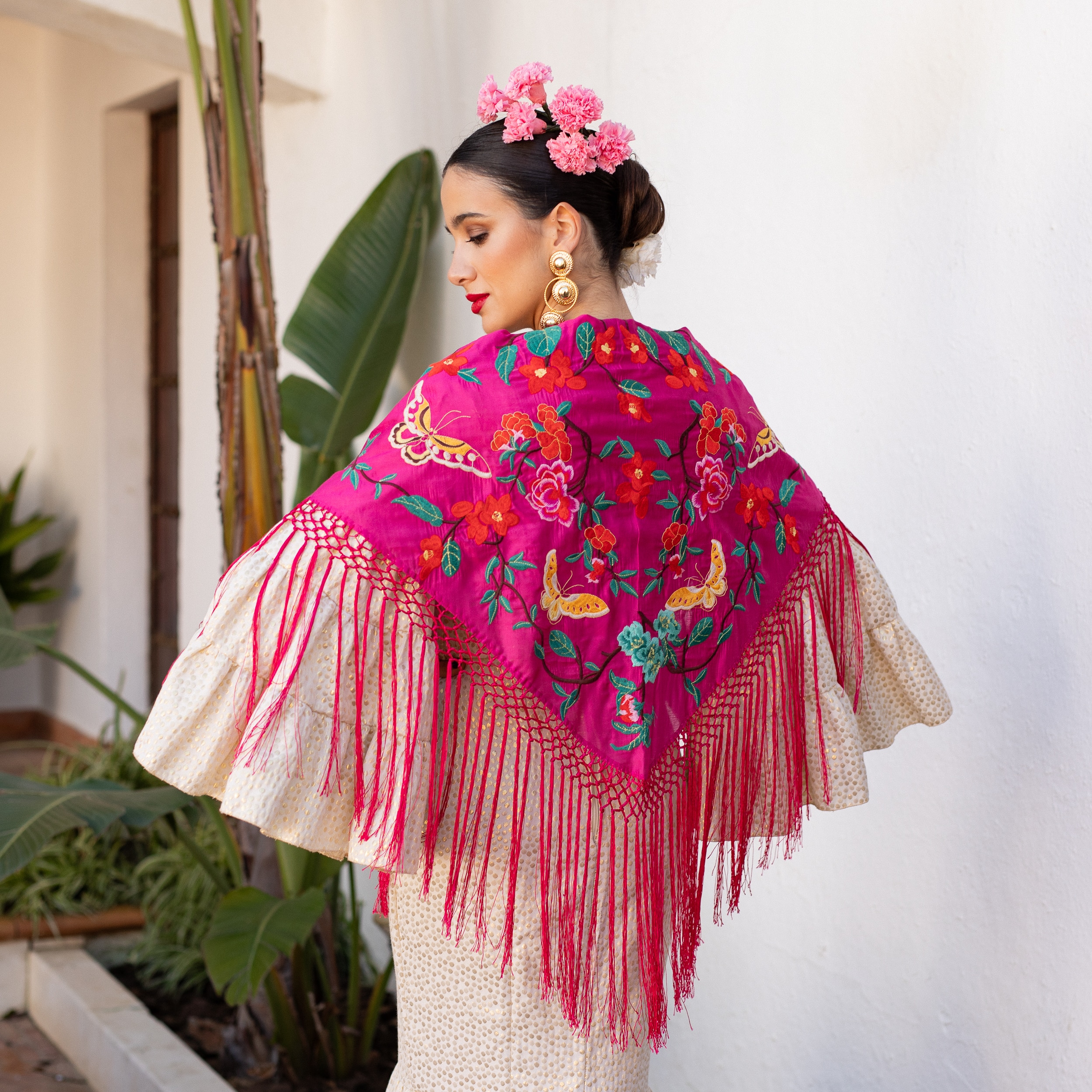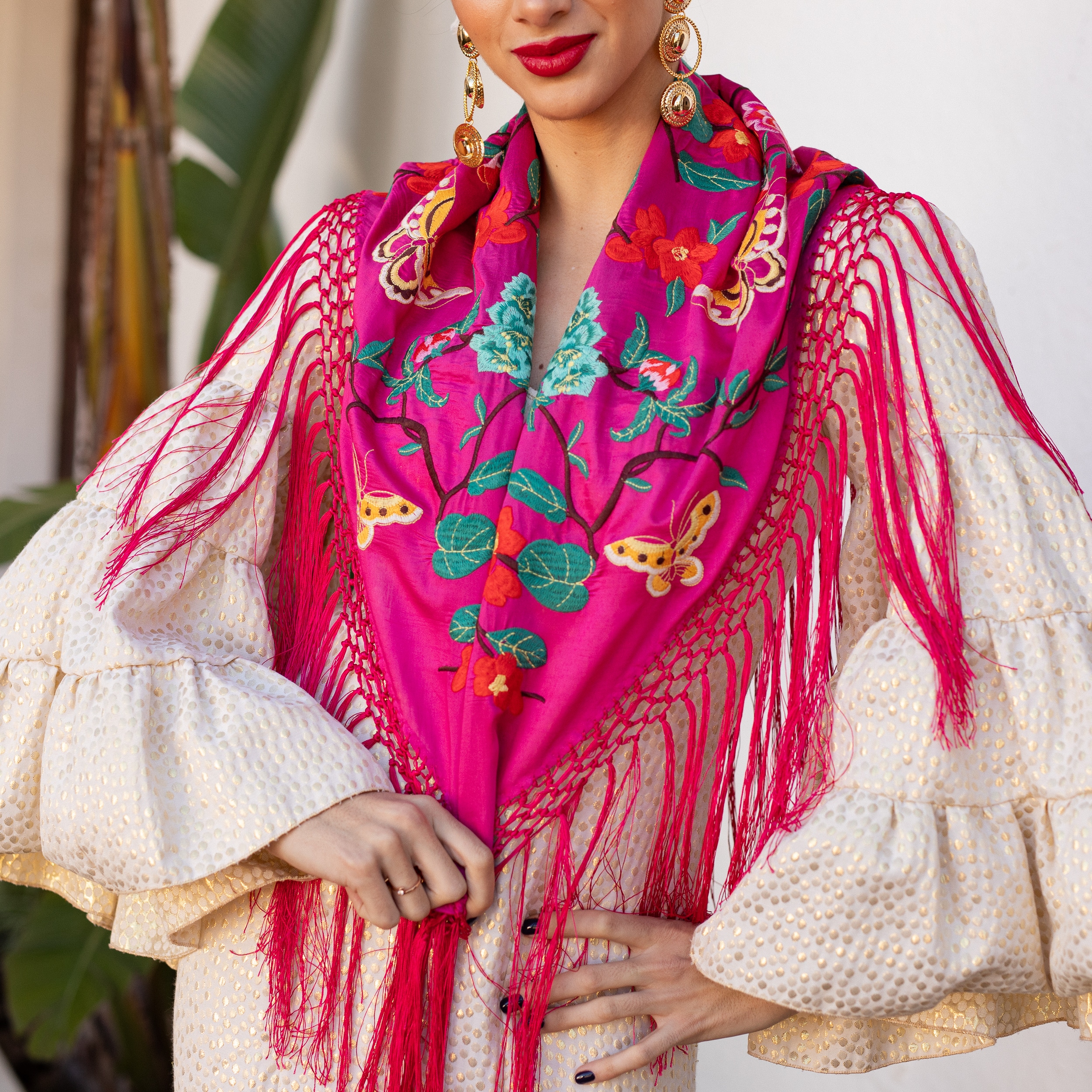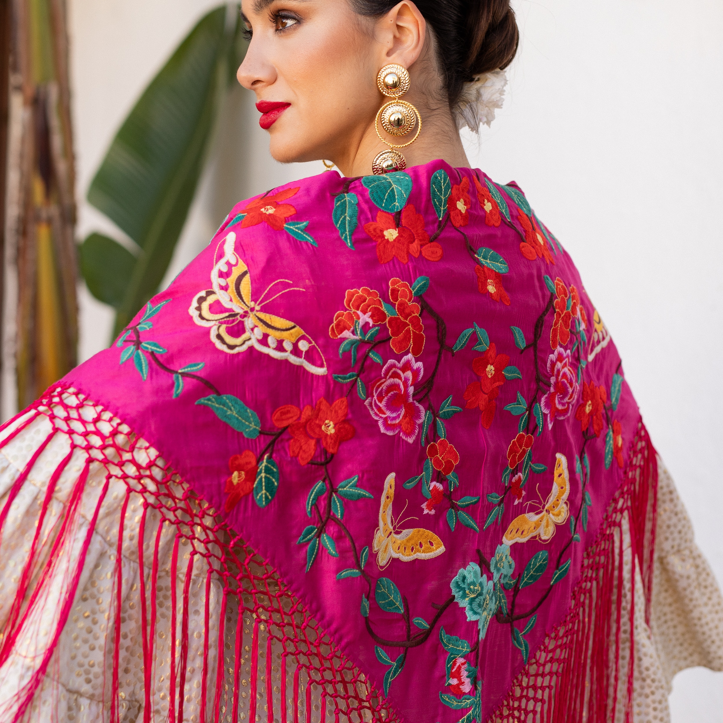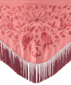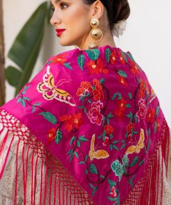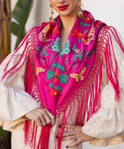 El color buganvilla, lleno de energía y sofisticación, se combina con los delicados bordados de flores y mariposas para ofrecer un diseño que no pasa desapercibido. Este mantoncillo es ideal para ferias, romerías y cualquier evento flamenco, añadiendo un toque vibrante y único a tu look.
