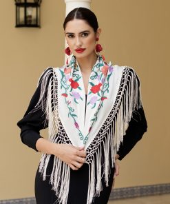 Tiene bordados de flores de muchos colores y mariposas. Esto crea un contraste visual. Captura la esencia del espíritu flamenco: pasión, energía y belleza.
